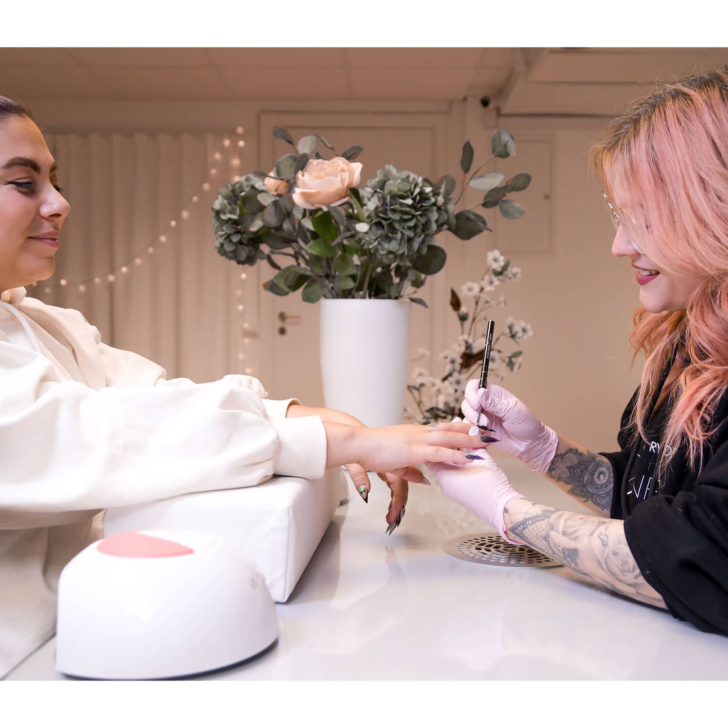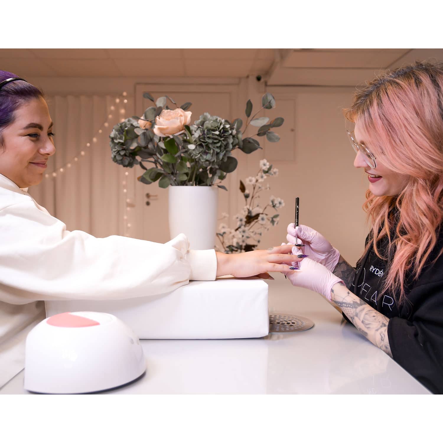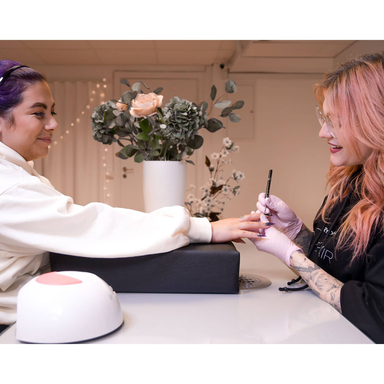 We recommend to use a paper towel or regular towel on top of your arm rest for your work space to be as hygienic as possible and switch it out in between clients. Clean the arm rest with cleaning wipes but stay away from acetone and chemicals that are strong enough to melt plastic.