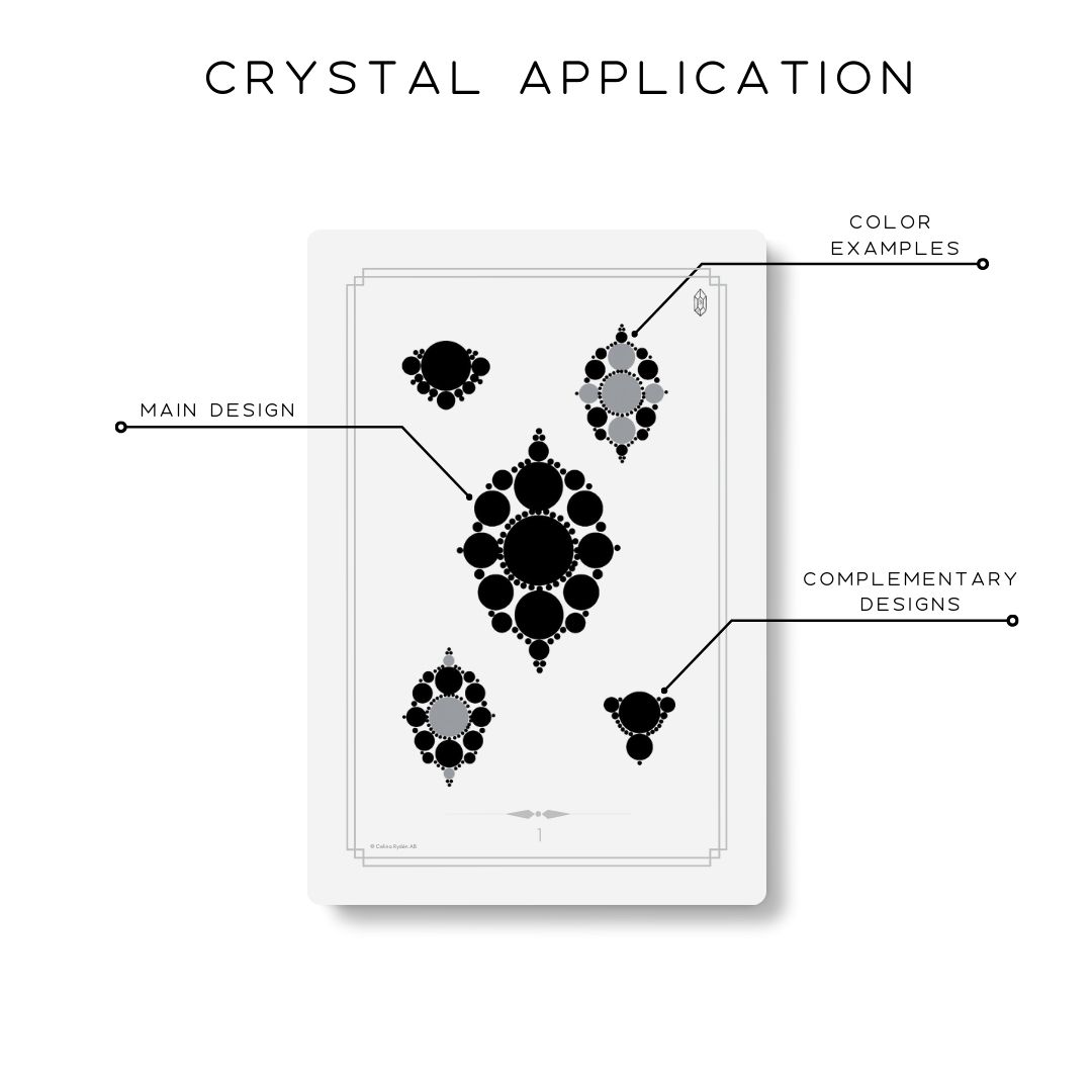 The deck has 20 cards in total, including one card with intructions and helpful tips on how to apply your crystals. The other 19 cards includes 1 main design, 2 complementary smaller designs and 2 color combo suggestions on each card!